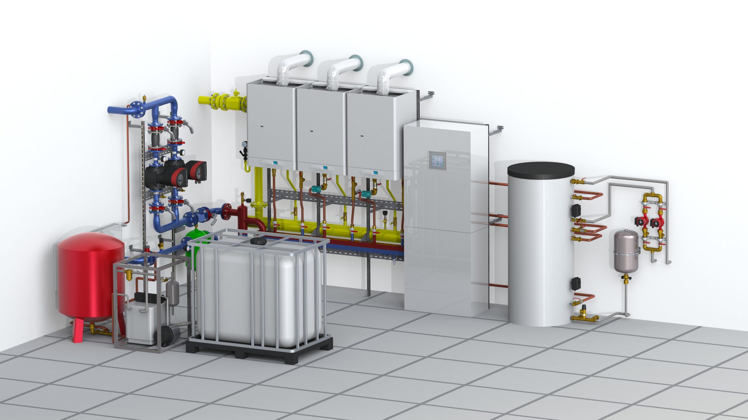 The location of the boiler room in a building is variable. Which part of the building is the most suitable for the location of the cascade boiler room needs to be decided on the basis of the properties and dispositional possibilities of the building. When making the decision, it is essential to consider the options of the flue gas installation, boiler room ventilation, hydraulic design of the entire heating system, the dimensions of the installation site, etc. The low demands on the location of the cascade boiler room make it possible to install it almost anywhere.