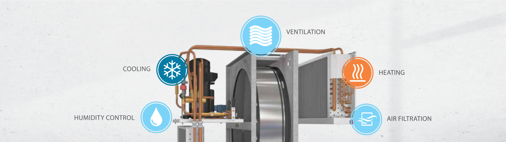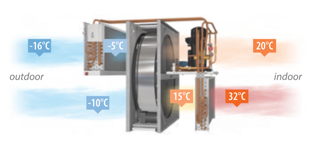 Highly efficient rotary heat exchanger is used for first stage heat recovery, recovering the biggest part of the heat of extracted air. For second stage heat recovery and supply air temperature control, heat pump is used.